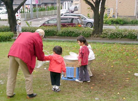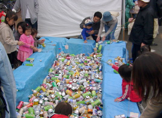 毎度お馴染みの缶つり。「池」の周りは回収コンテナで固定してますが、興奮したお子様が前進して行き