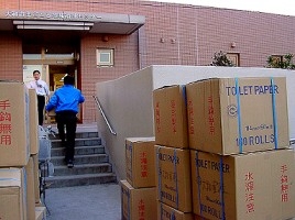 | れ玉川理事長から土屋市長にトラック1台分(7200個)のトイレットペ |