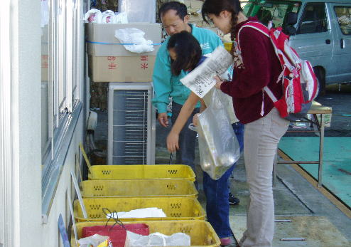| 天気も良く、急遽作った看板も映えていました!(作って良かった。。。) | お客さんの市民さんです!このように資源を出して頂いています。奥は青年部部長、福留秀雄。 |