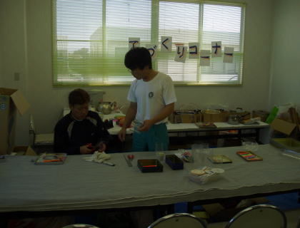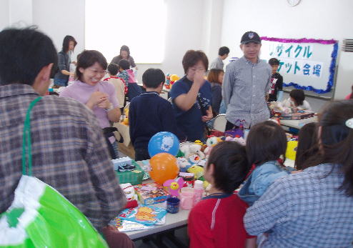 | 平成16年12月5日(日)柳橋エコセンターにて青年部主催で初の試みとなる、家庭でいらない物を持ち寄り、現金を一切使わないフリーマーケットを開催致しました。対象は小学生までとし、出店者には事前に説明会を開き出店して頂き、お客様となる市民さんには資源をもって来ましたら300(円分の)エコマネーを渡し会場にてエコマネーと出品者の品物と交換して頂くという新しい形式を取りました。会場にはもう一つ、”トイドック大和”様より1日だけのオモチャ病院も併設され、こちらは順番待ちが出来るほどの大盛況! 当日は天気も良く、たくさんの市民さんに来場していただきました! |