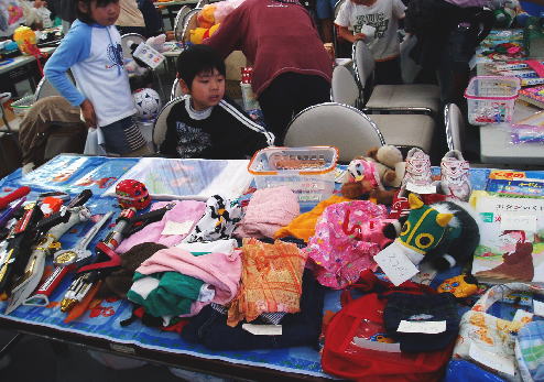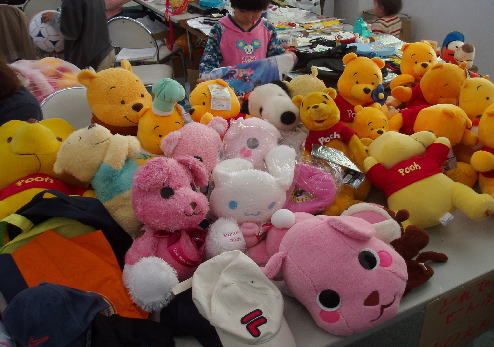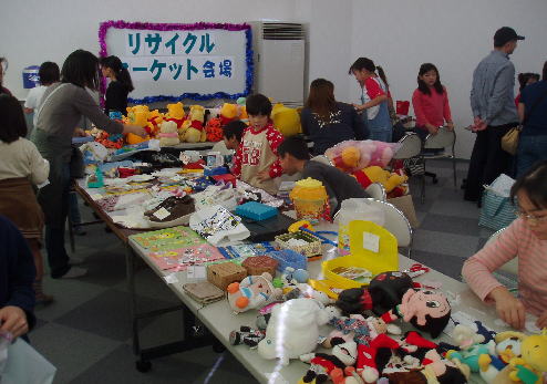 | リサイクルマーケット会場は大にぎわい!たくさんの品物がエコマネーと交換されて行きました! | これいらない物なの?疑いたくなる物ばかり!綺麗に保存された縫いぐるみやオモチャがたくさん! |