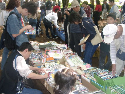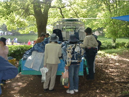 | 古本コーナーの開店直後の様子です。凄いお客さん。 | こちらも開店直後のジーパン販売です。女性のお客さんが目立ちました。 |