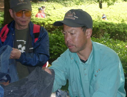 | 初のお目見えシャボン玉。泡だらけになりながらたくさん作りました。 | 途中にわか雨が!急遽ブルーシートでテントを作り、本を守りました。 |