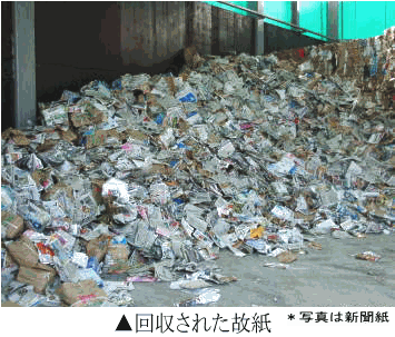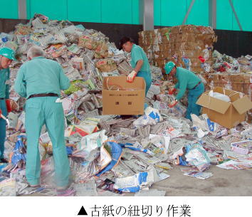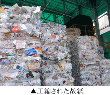 大和市で回収された故紙は段ボール、新聞紙、雑誌に分別され、梱包したひもを切りラージベーラーに運ばれ、圧縮梱包された故紙が出てきます。