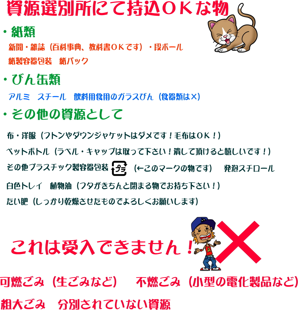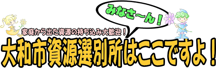 | いつも資源回収にご協力頂いて誠に有り難うございます! 私達組合ではもっと資源回収に力を入れるため、平成11年から ご家庭から出た大和市民の資源受入を始めております。 今までにたくさんの方が資源選別所に御来所されましたが、もっと皆様に 知って頂くためこのページを作りました。 お電話でのお問い合わせ多い資源選別所の行き方と、資源の出し方について説明致します。 |